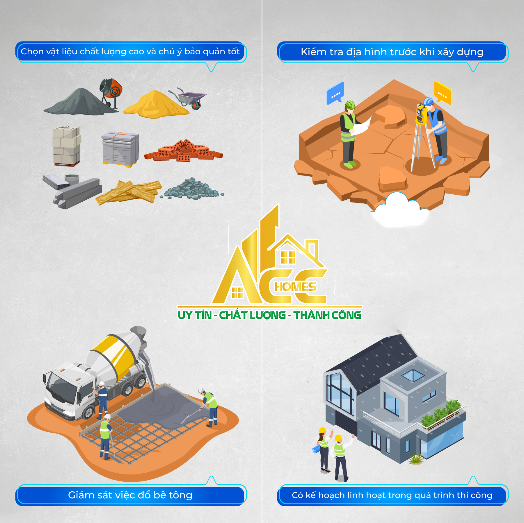 Acc – Homes sở hữu đội ngũ kỹ sư, kiến trúc sư giàu kinh nghiệm cùng đội thợ tay nghề cao, tất cả đều được đào tạo bài bản và thường xuyên cập nhật những công nghệ xây dựng mới nhất. Quy trình làm việc của chúng tôi luôn đảm bảo tính minh bạch, từ việc tư vấn chi tiết miễn phí, khảo sát công trình tỉ mỉ đến lập dự toán rõ ràng và hợp đồng đầy đủ các điều khoản bảo vệ quyền lợi khách hàng.